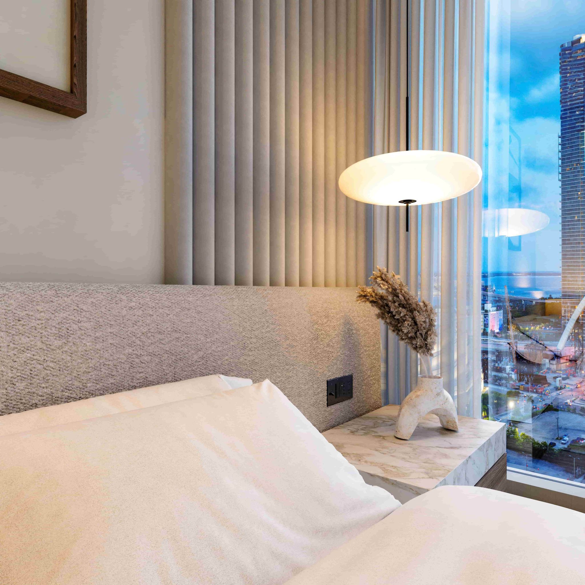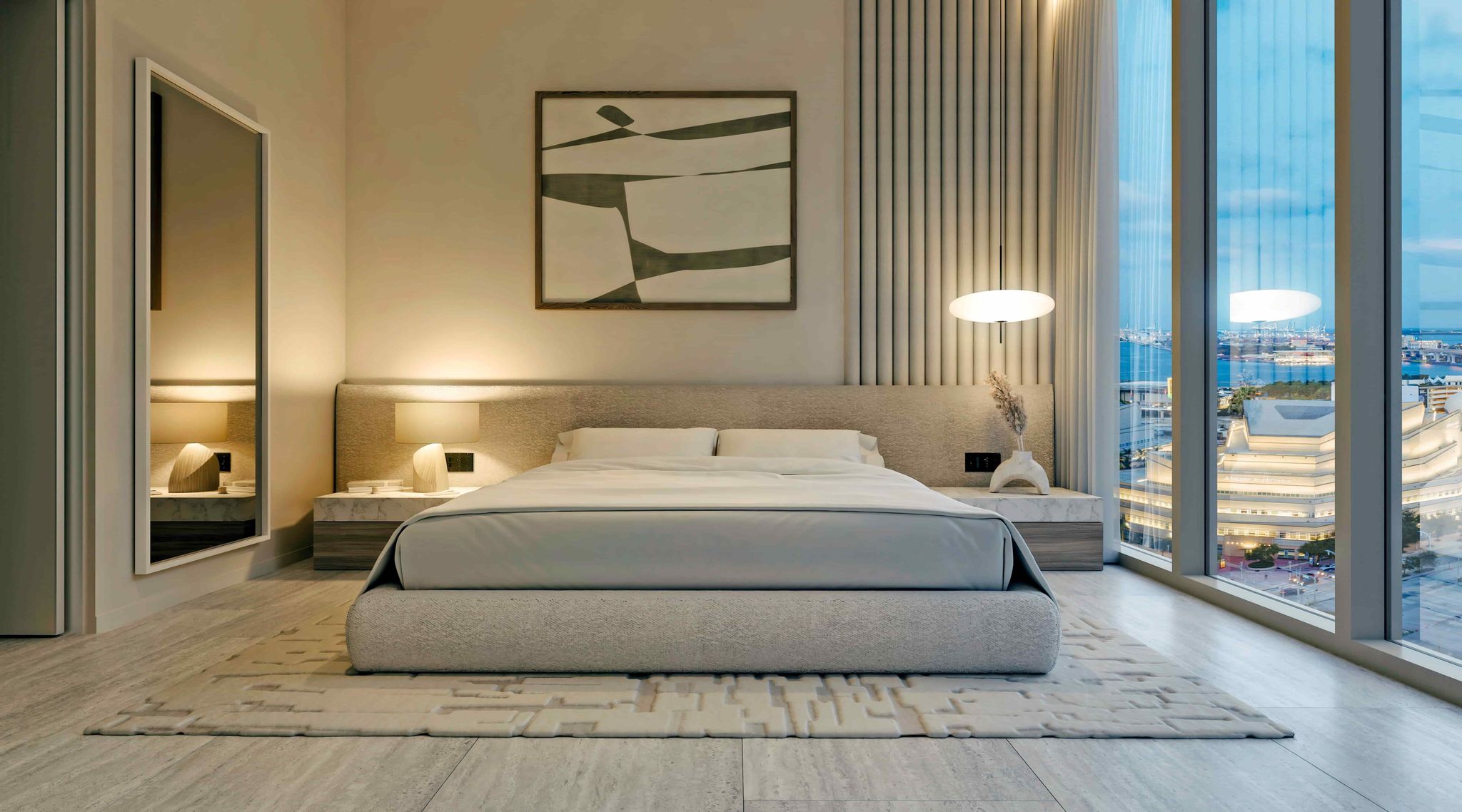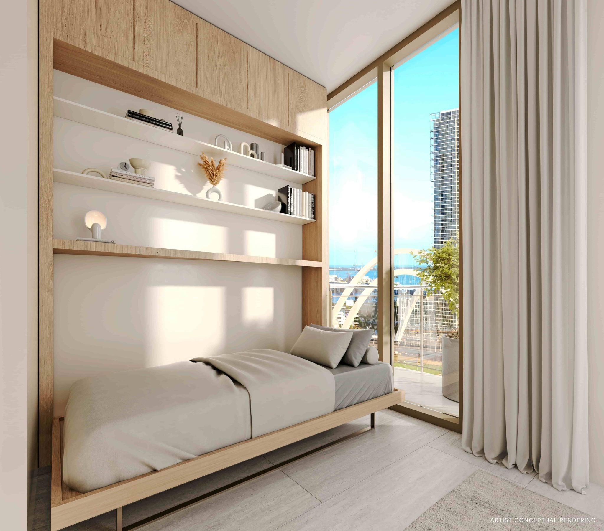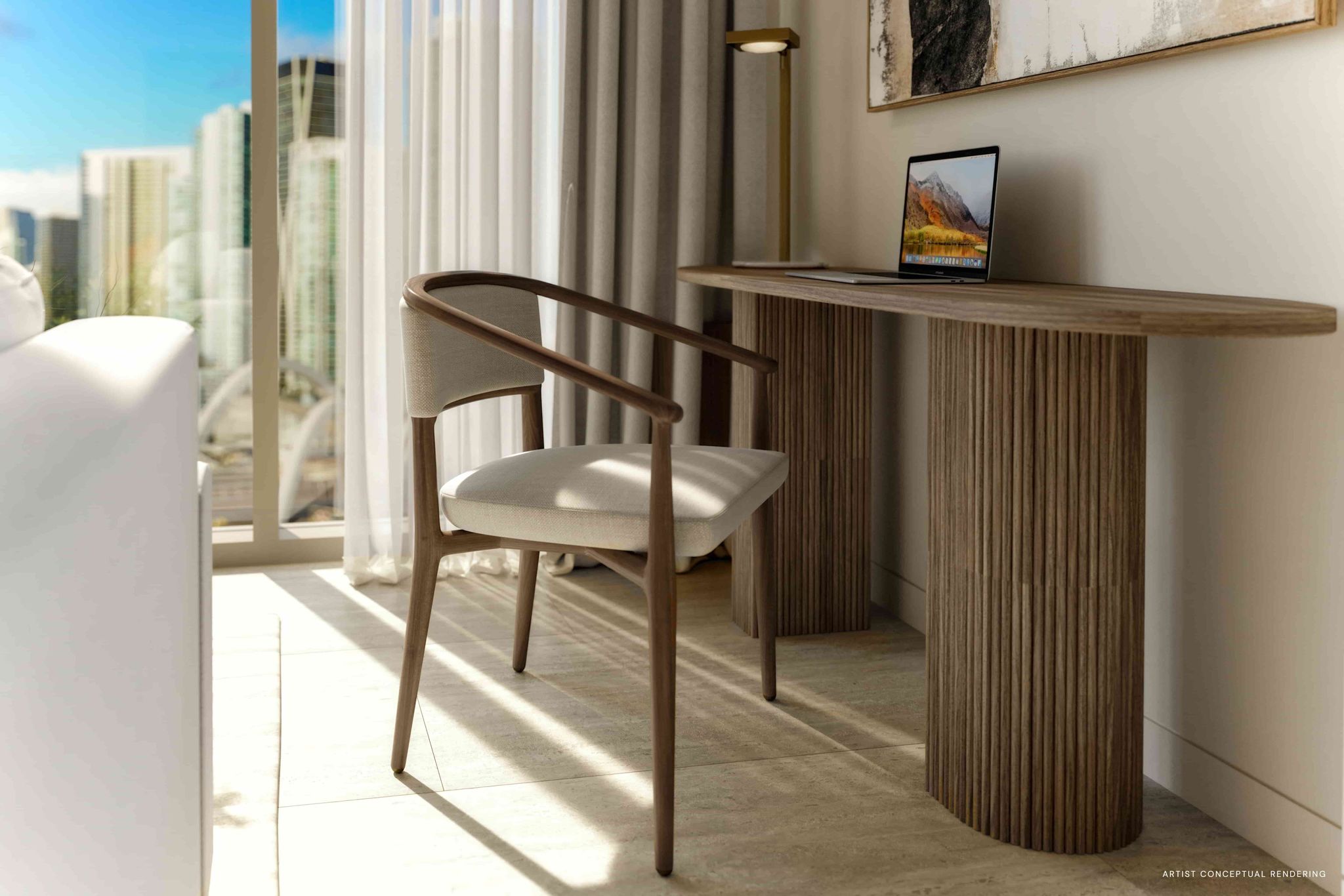 Offering studio, one-bedroom, and two-bedroom residences, the building is designed for modern urban living with efficient layouts, high ceilings, and floor-to-ceiling glass that frames views of the Miami skyline and Biscayne Bay.