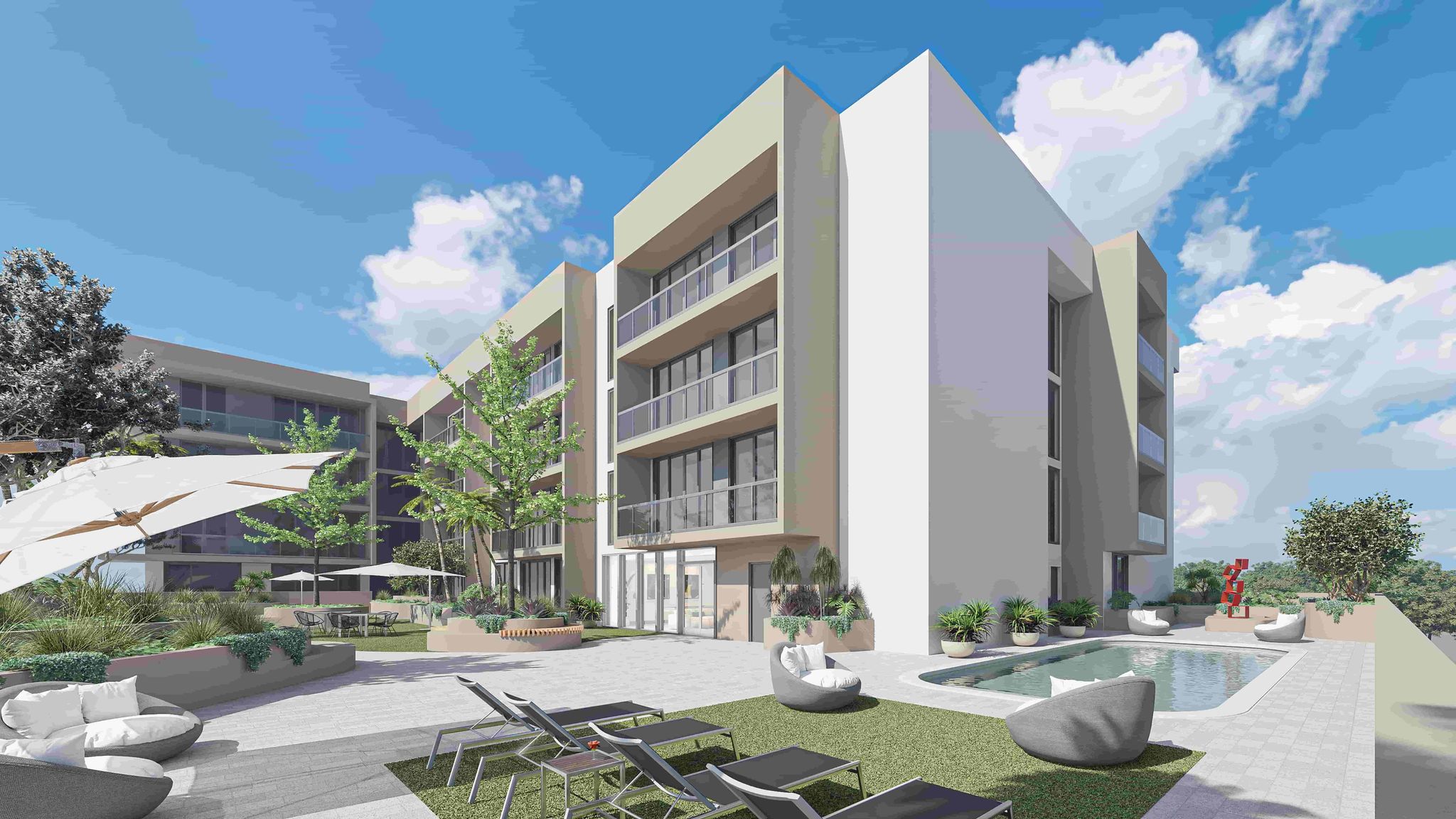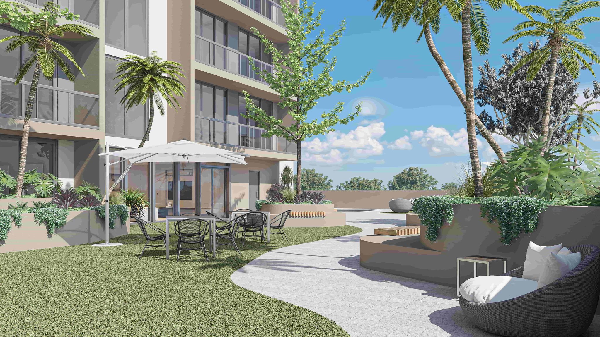 • Lush landscaped courtyard with a resort-style pool surrounded by greenery, creating a tranquil retreat within the building