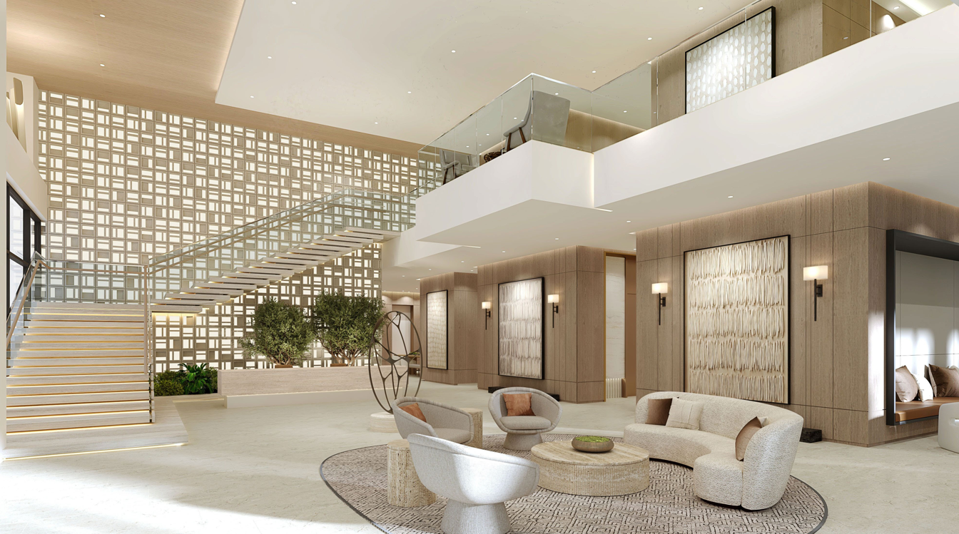 - Grand lobby with double-height ceilings and sophisticated lounges