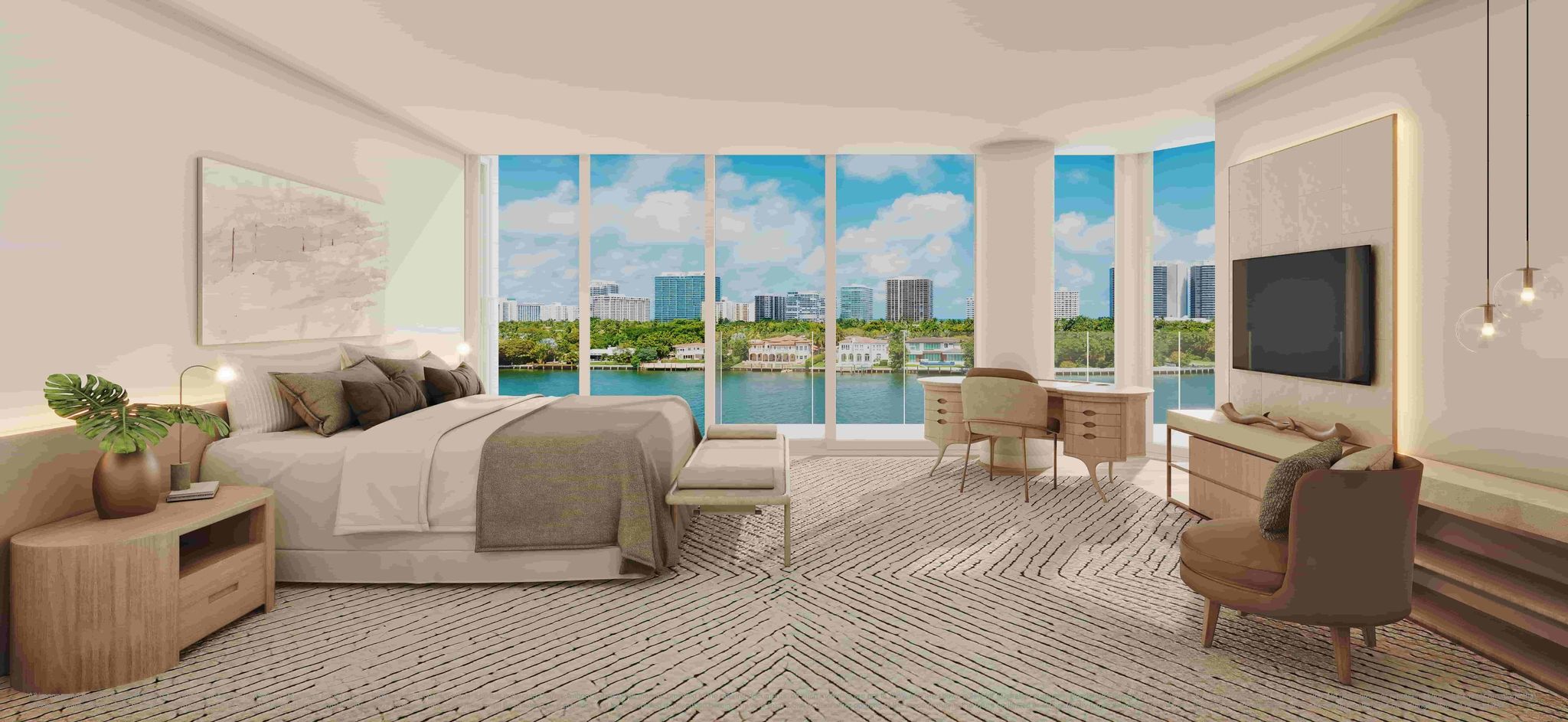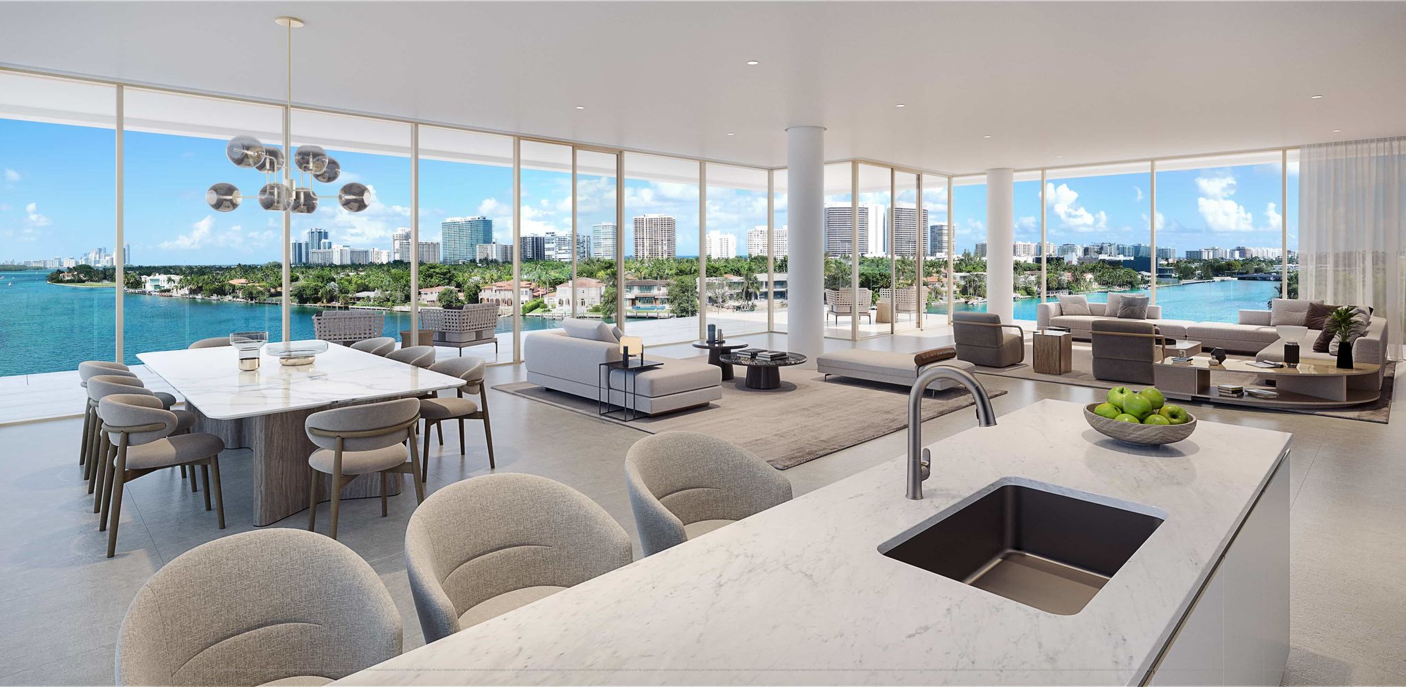- Floor-to-ceiling glass windows and wrap-around glass walls with no solid exterior walls, allowing uninterrupted Biscayne Bay views, abundant natural light, and continuous sea breezes