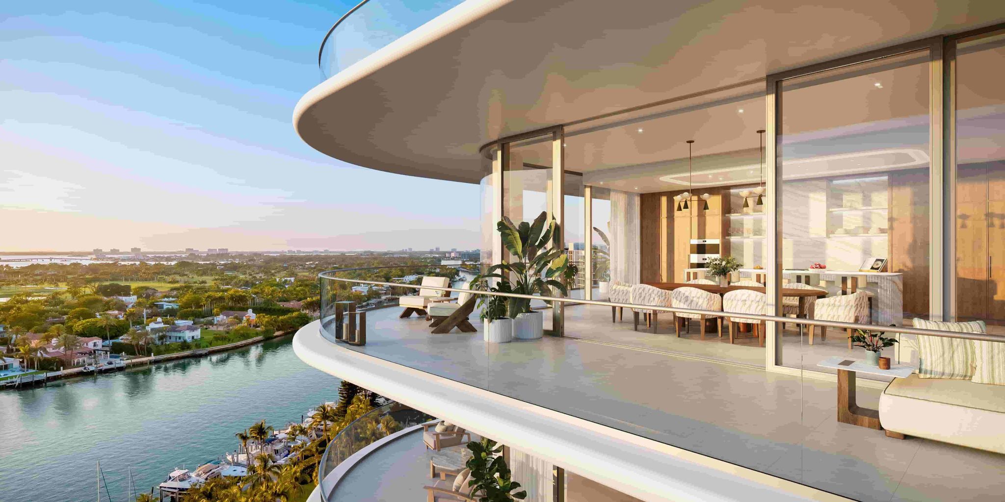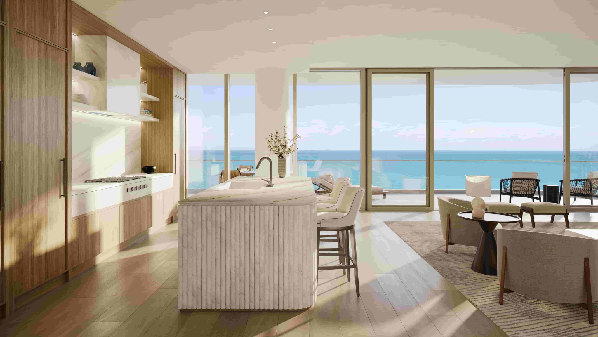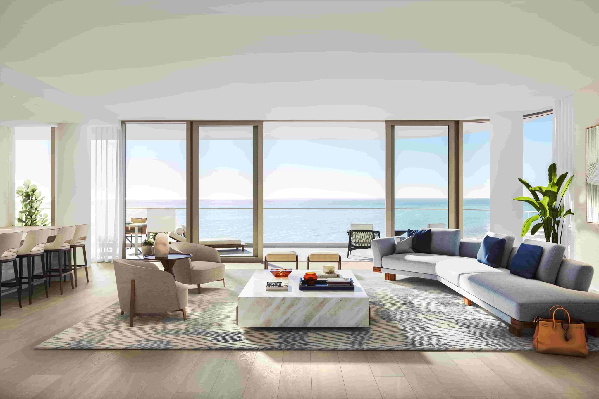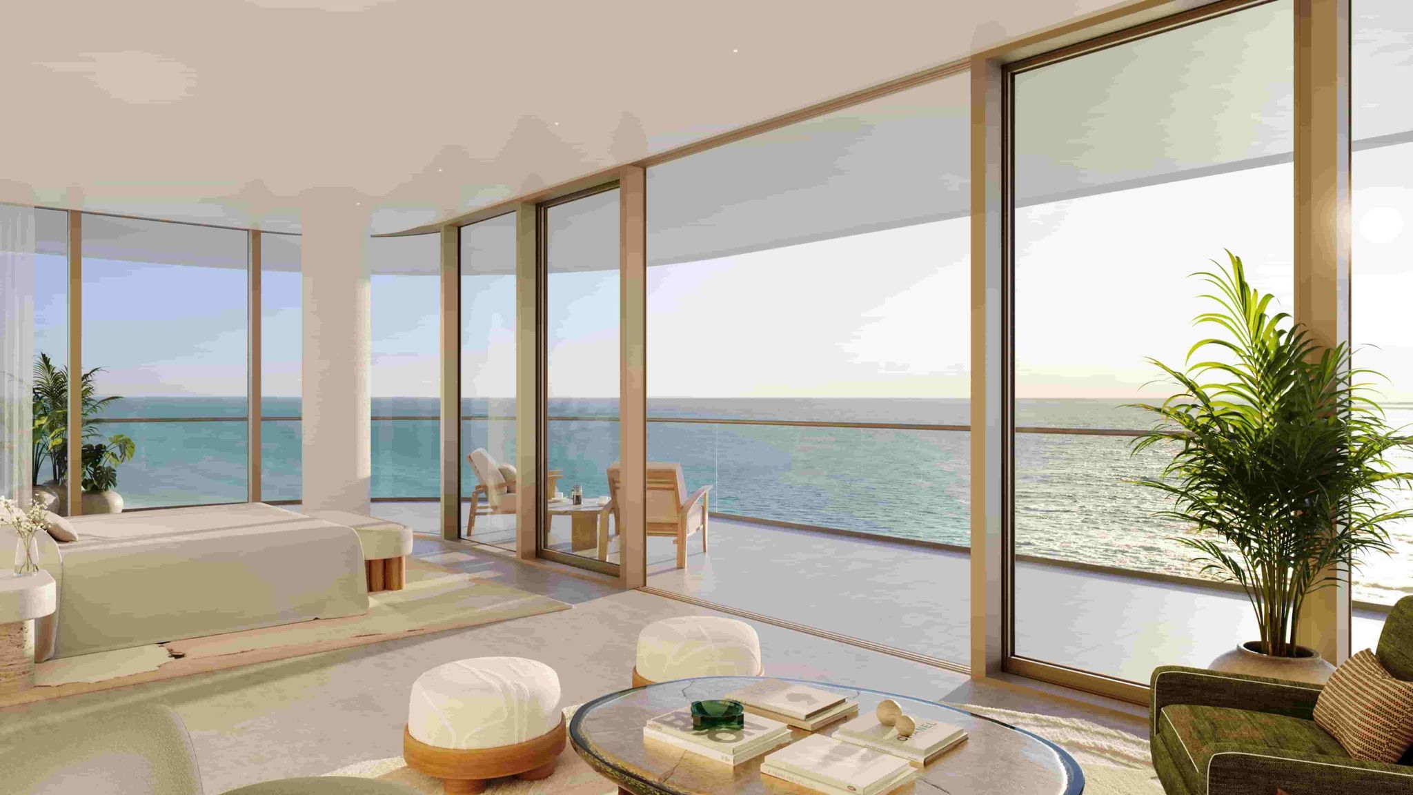 - Wrap-around terraces with architectural glass railings in most residences, extending living areas outward toward the ocean