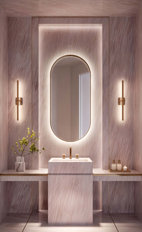 - Powder rooms finished with Rosa Aegeo marble walls, floors, and bespoke lighting features