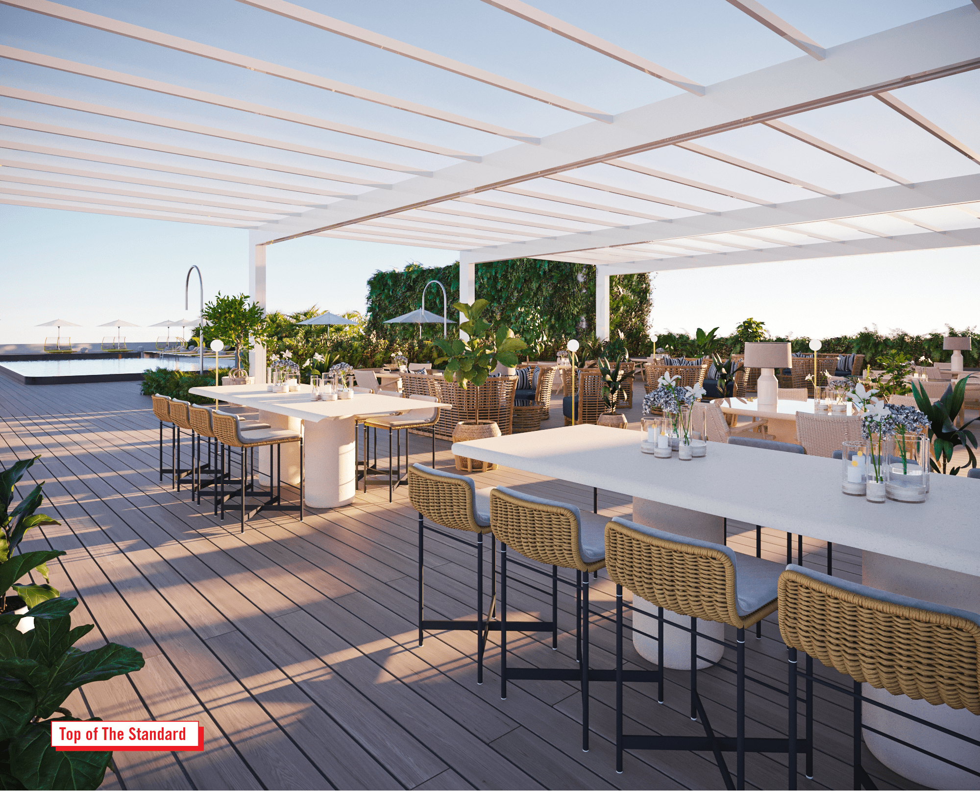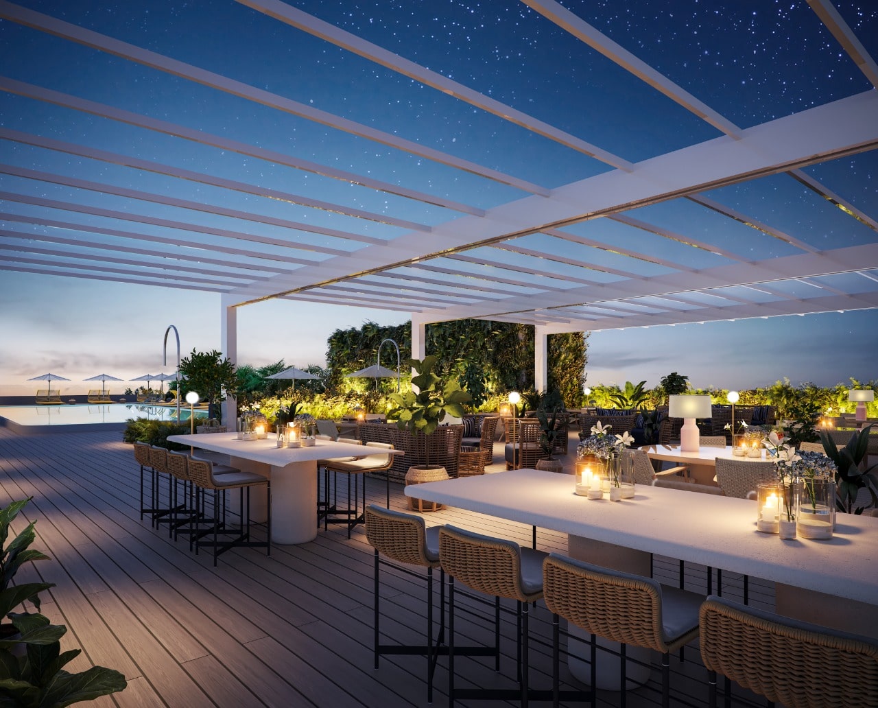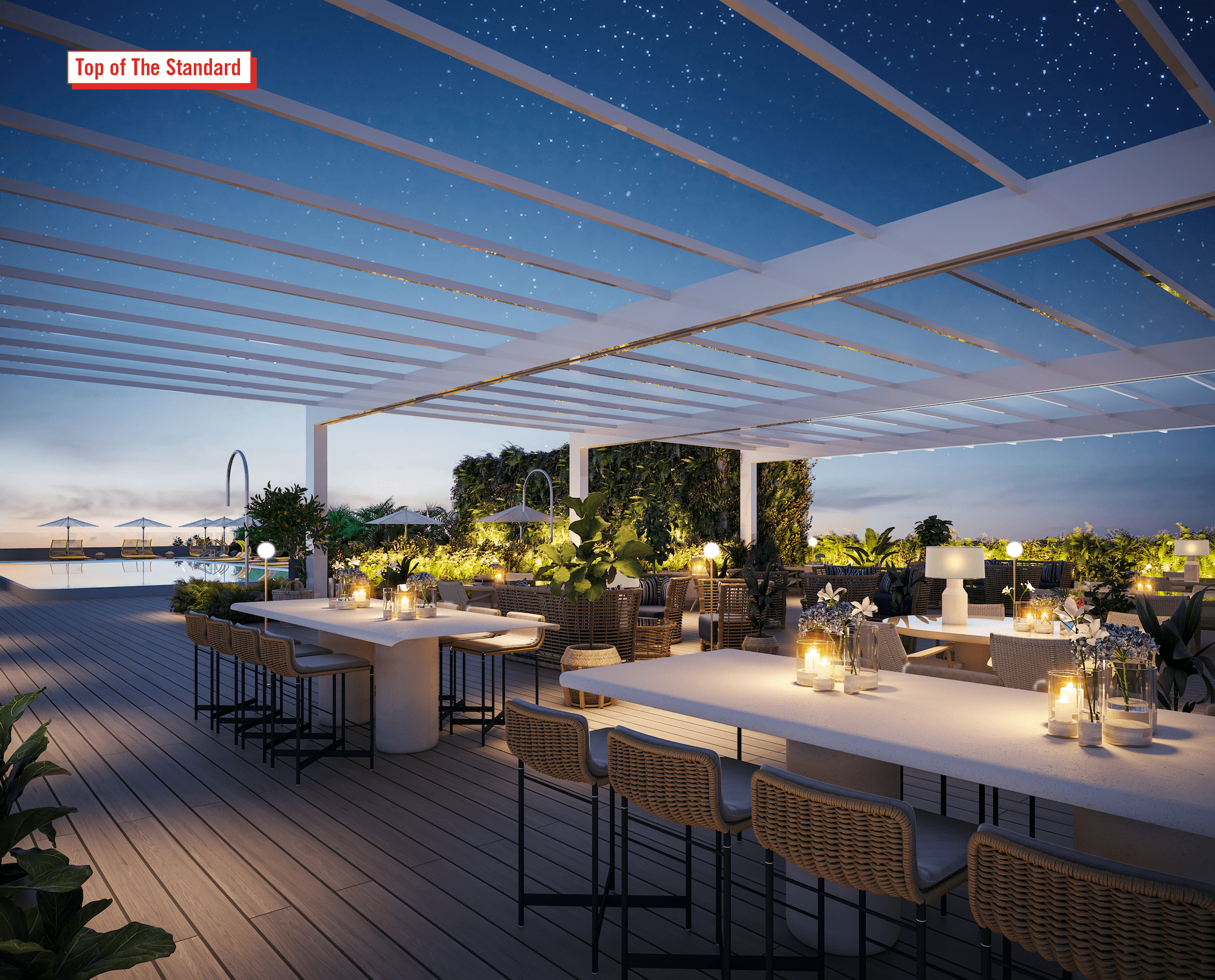 - Panoramic rooftop pool with summer kitchen and bar